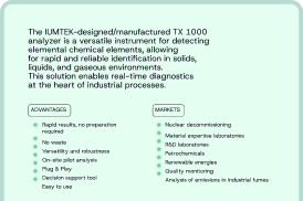 L’analyseur TX 1000 est un instrument polyvalent de détection d’éléments chimiques élémentaires, qui permet une identification rapide et fiable dans les solides, liquides et milieux gazeux. Son format compact et totalement autonome ne nécessite ni consommable, ni acide, ni Argon. De technologie intrinsèquement verte, il peut être installé dans tous lieux sans exigences particulières (laboratoire, site de production, bureau).